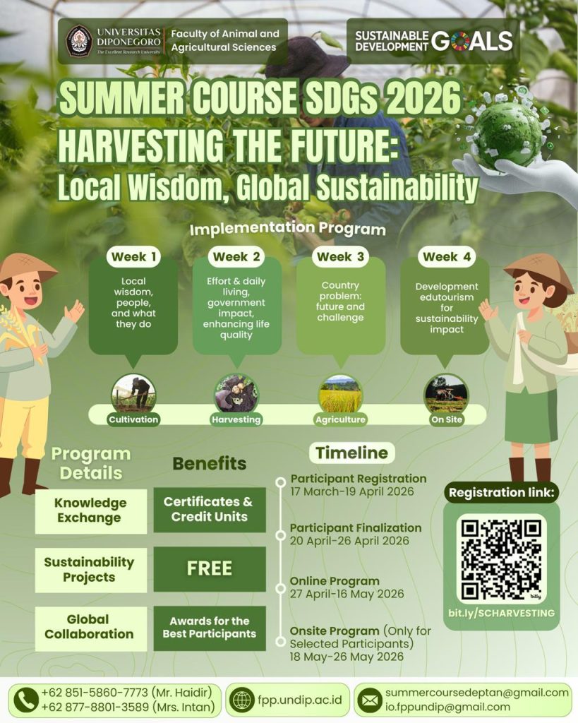 The Faculty of Animal and Agricultural Sciences, Universitas Diponegoro invites International students to participate in Summer Course SDGs 2026, an international program designed to explore sustainable agriculture, local wisdom, and global sustainability challenges. This program provides an opportunity for participants to exchange knowledge, collaborate with global peers, and develop innovative ideas related to sustainability and community development.