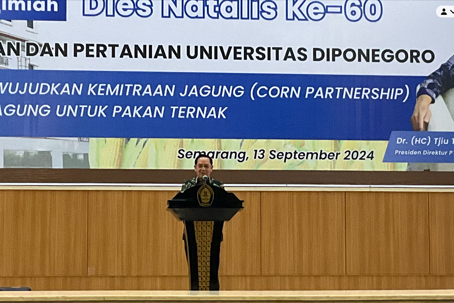 Semarang-tp.fpp.undip.ac.id – Fakultas Peternakan dan Pertanian Universitas Diponegoro menyelenggarakan orasi ilmiah bertema “Innovation for the Sustainability” dengan menghadirkan Dr. (HC) Tjiu Thomas Effency, S.E., MBA sebagai pembicara utama. Acara yang digelar di Gedung Prof. Soedarto ini dihadiri oleh sejumlah akademisi, pengusaha, serta pelaku industri pertanian. Dalam orasi ilmiahnya, Dr. Tjiu Thomas mengangkat topik “Strategic Initiative Mewujudkan Kemitraan Jagung Menuju Swasembada Jagung untuk Pakan Ternak.”